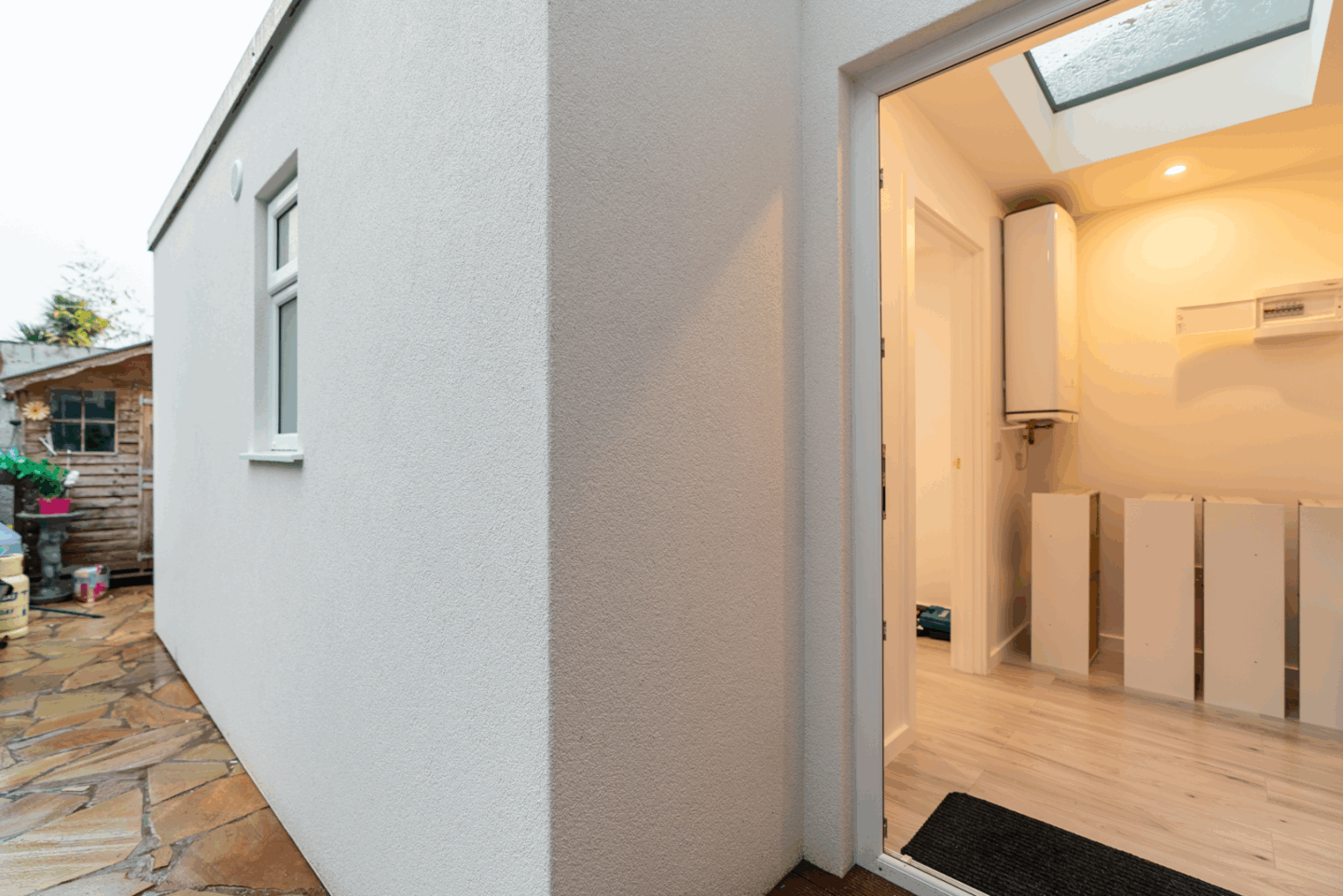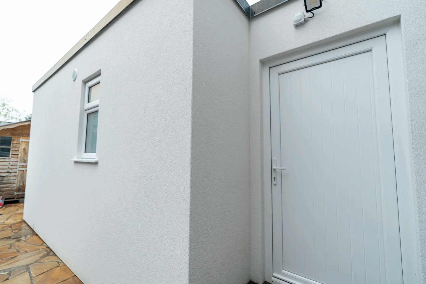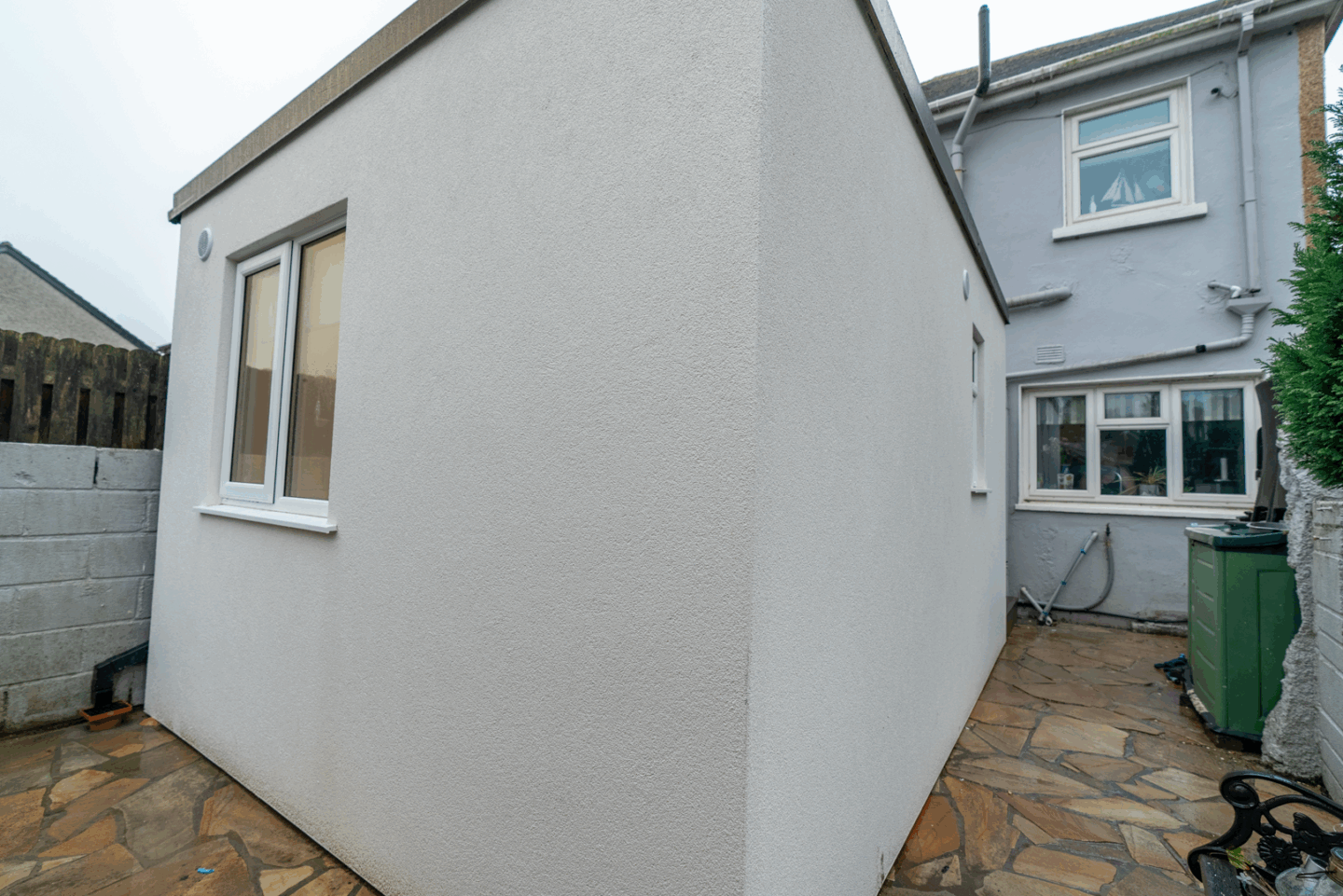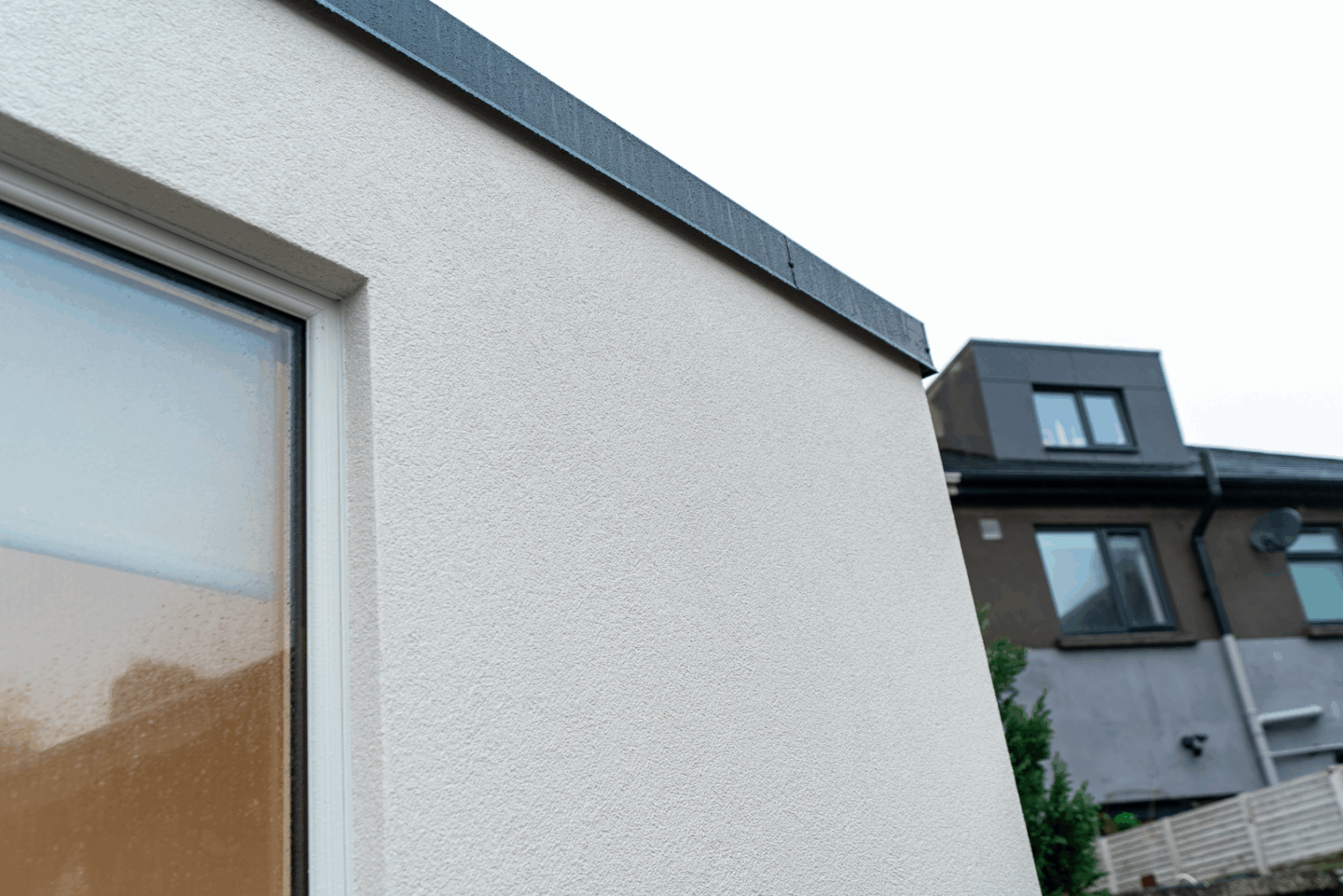 The roof is finished with torch-on felt, providing a long-lasting, weatherproof covering. The external walls are finished with acrylic render, offering a modern, clean aesthetic with low maintenance requirements. One side of the extension, adjacent to a neighboring property, is finished with metal cladding, chosen for its durability and minimal upkeep. The building is constructed as close as 10 cm to the existing wall, maximizing usable space while complying with building regulations and maintaining structural safety.