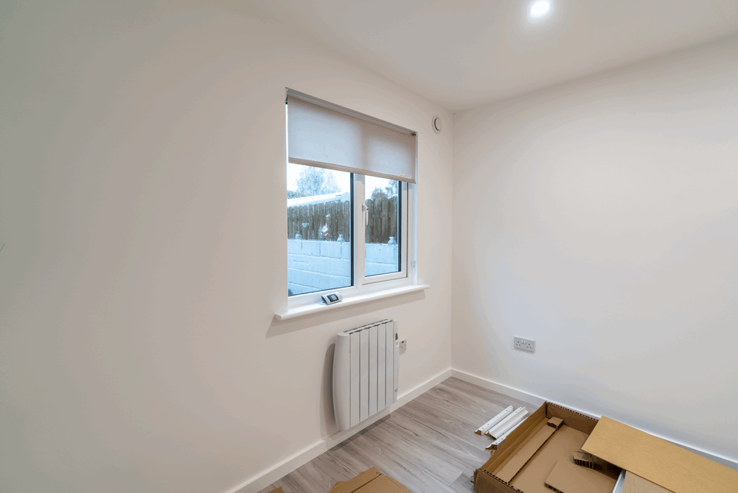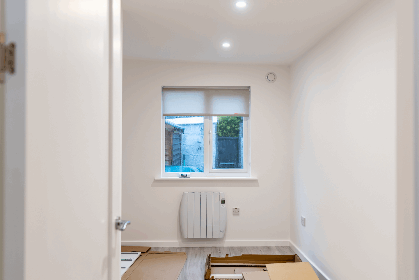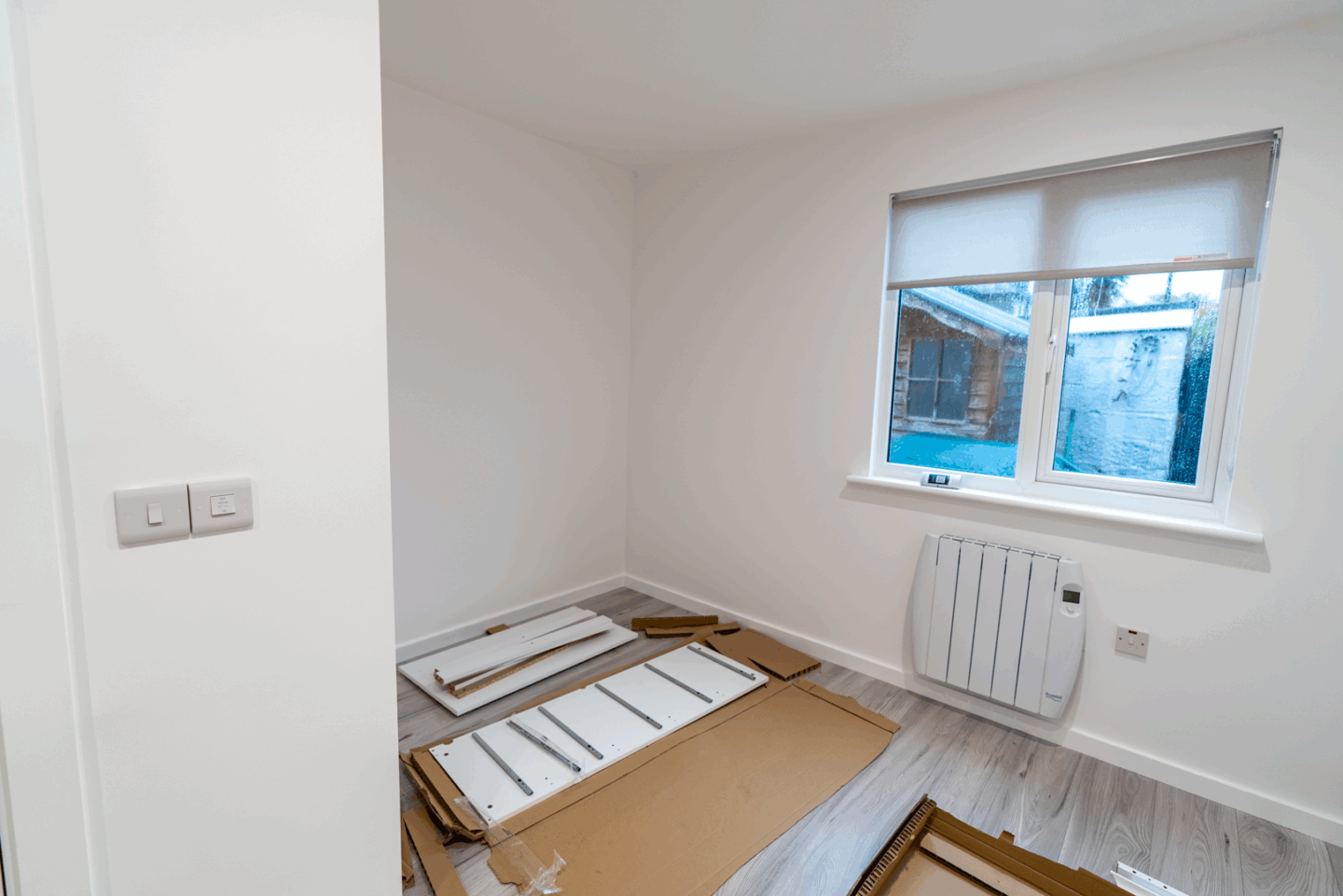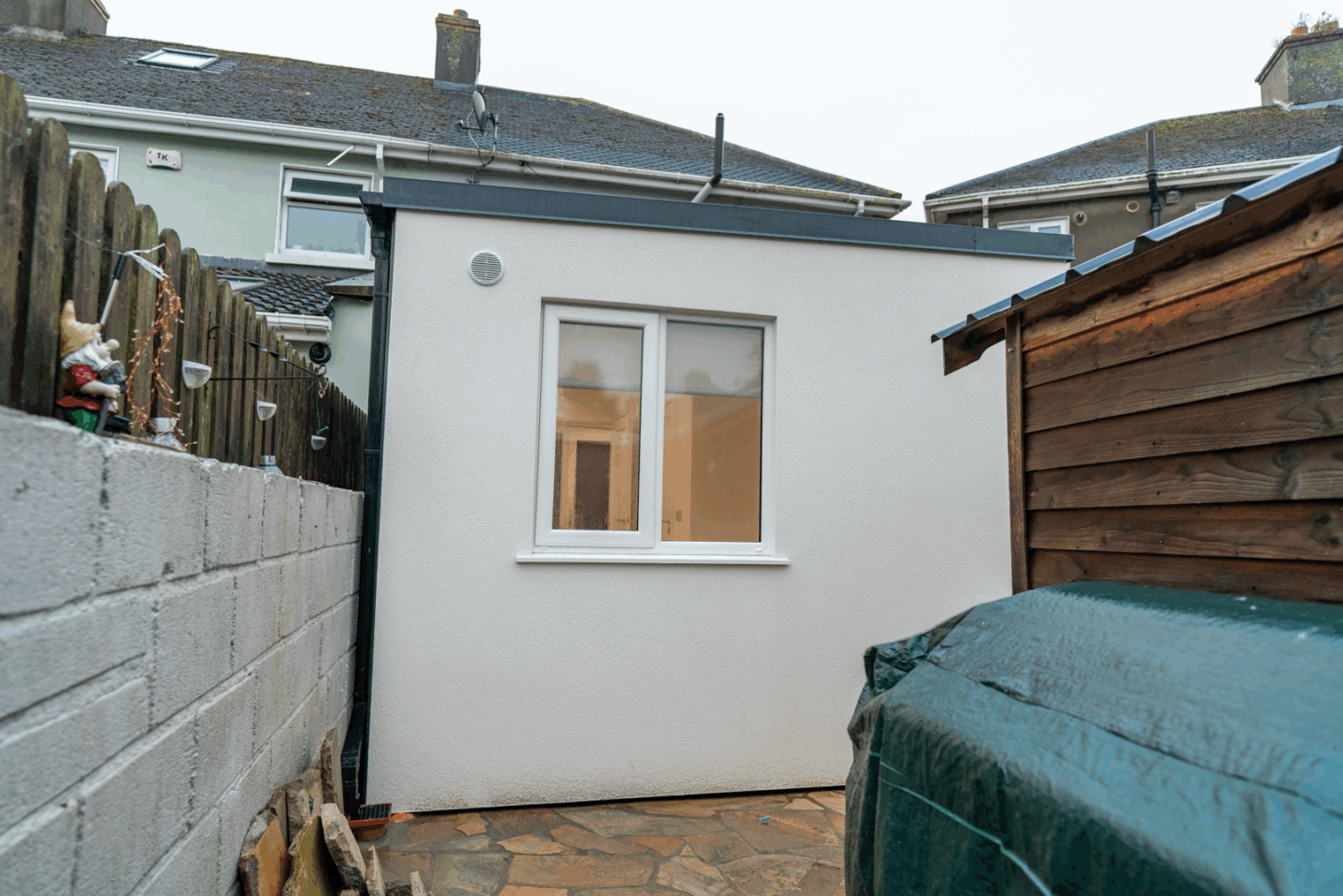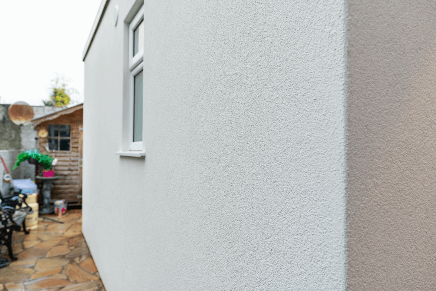 The roof is finished with torch-on felt, providing a long-lasting, weatherproof covering. The external walls are finished with acrylic render, offering a modern, clean aesthetic with low maintenance requirements. One side of the extension, adjacent to a neighboring property, is finished with metal cladding, chosen for its durability and minimal upkeep. The building is constructed as close as 10 cm to the existing wall, maximizing usable space while complying with building regulations and maintaining structural safety.