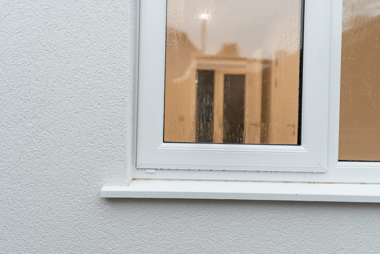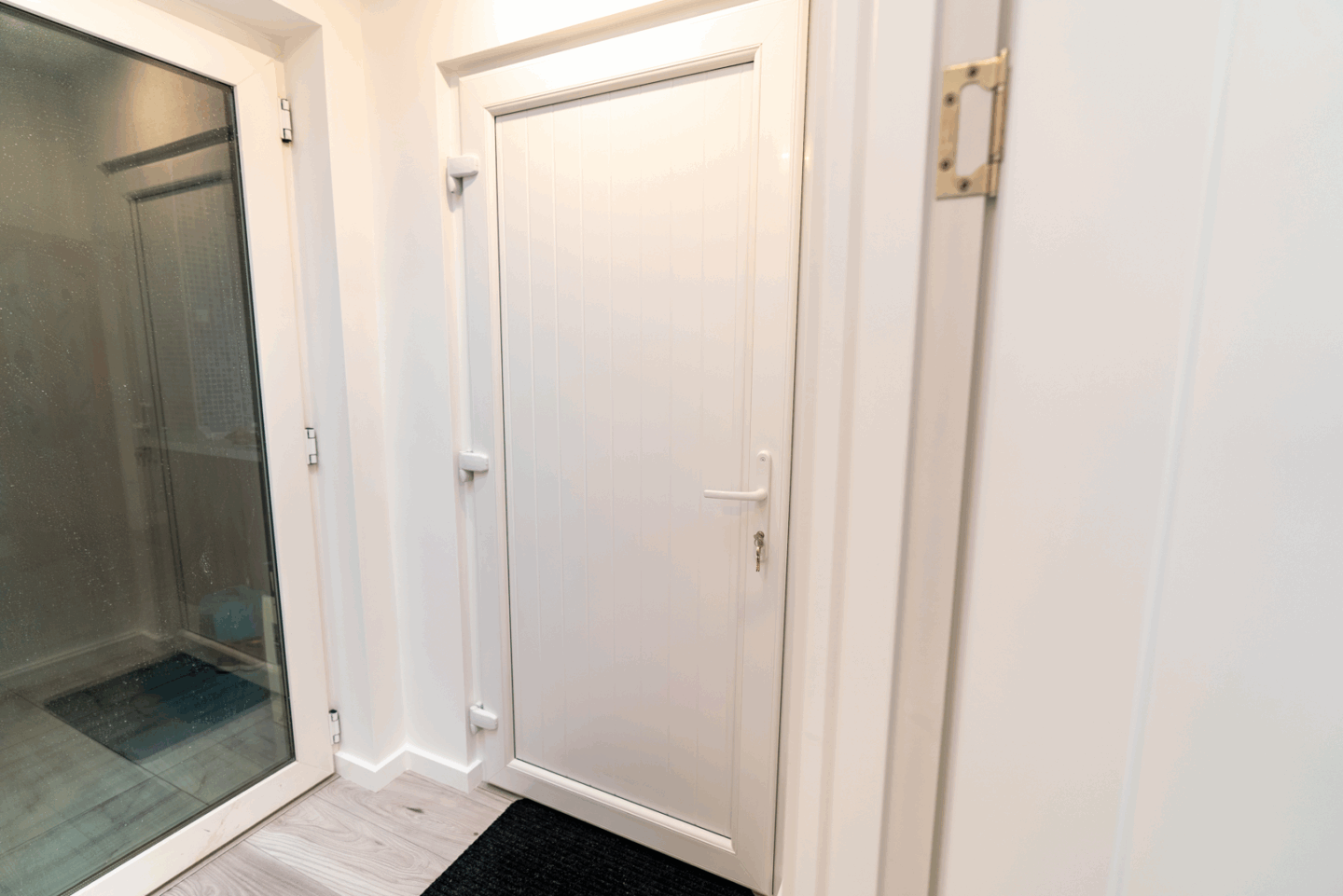 - Windows & Doors: White double-glazed PVC windows and a PVC tongue-and-groove cladding texture door in white.