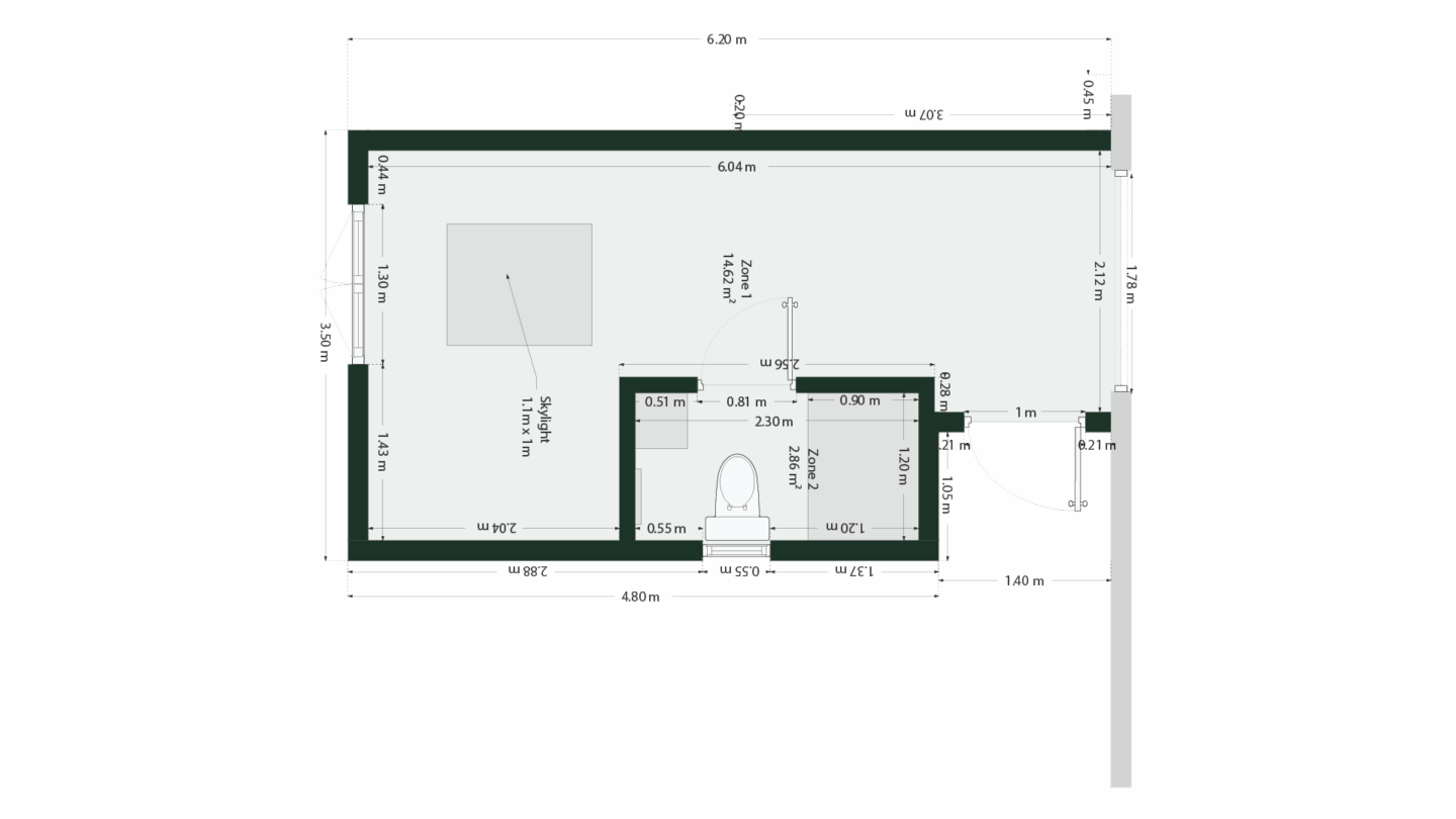 - Skylight: 1.1m x 1m skylight for natural light and ventilation.