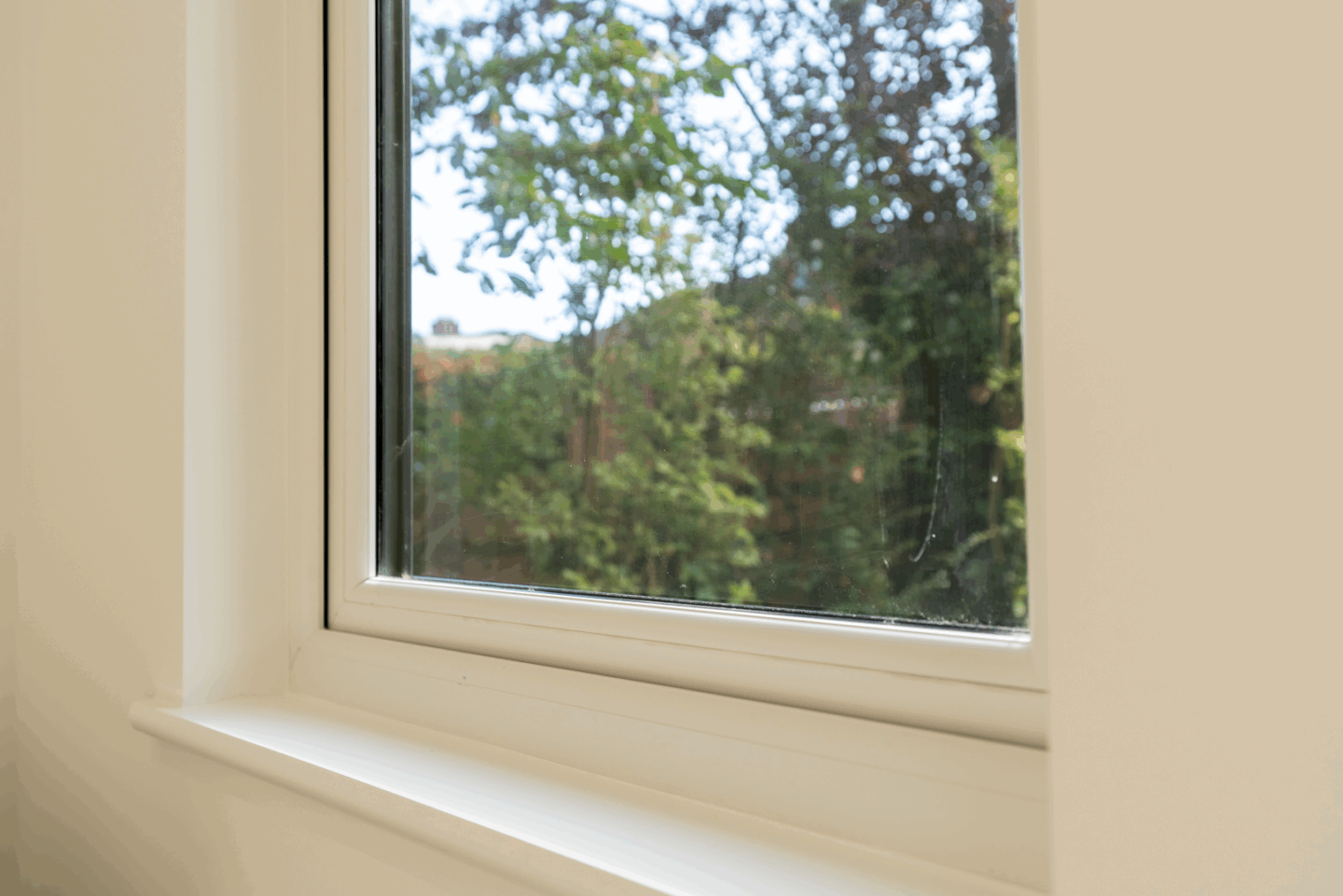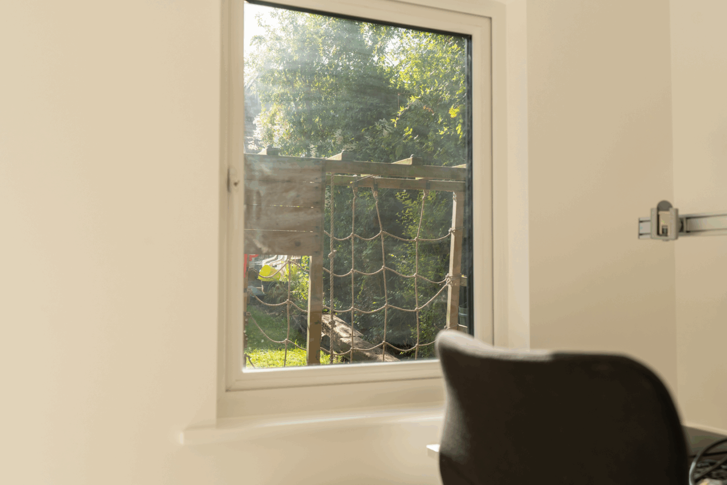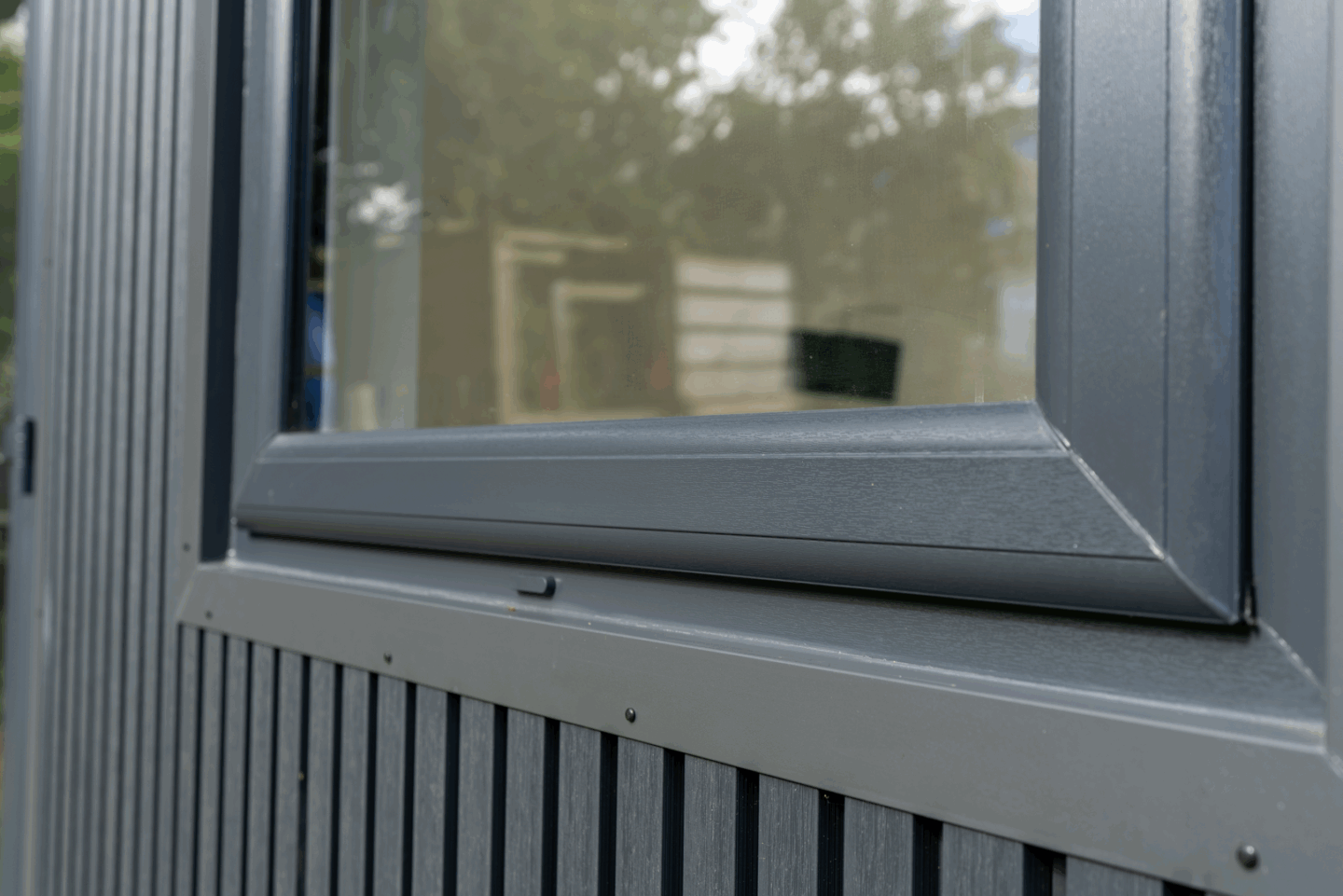 The unit features double-glazed PVC frames designed for efficiency and modern style. The frames are anthracite-colored on the exterior, giving the unit a sleek architectural look, while the white interior finish helps maintain brightness indoors. Double glazing also enhances insulation and soundproofing.