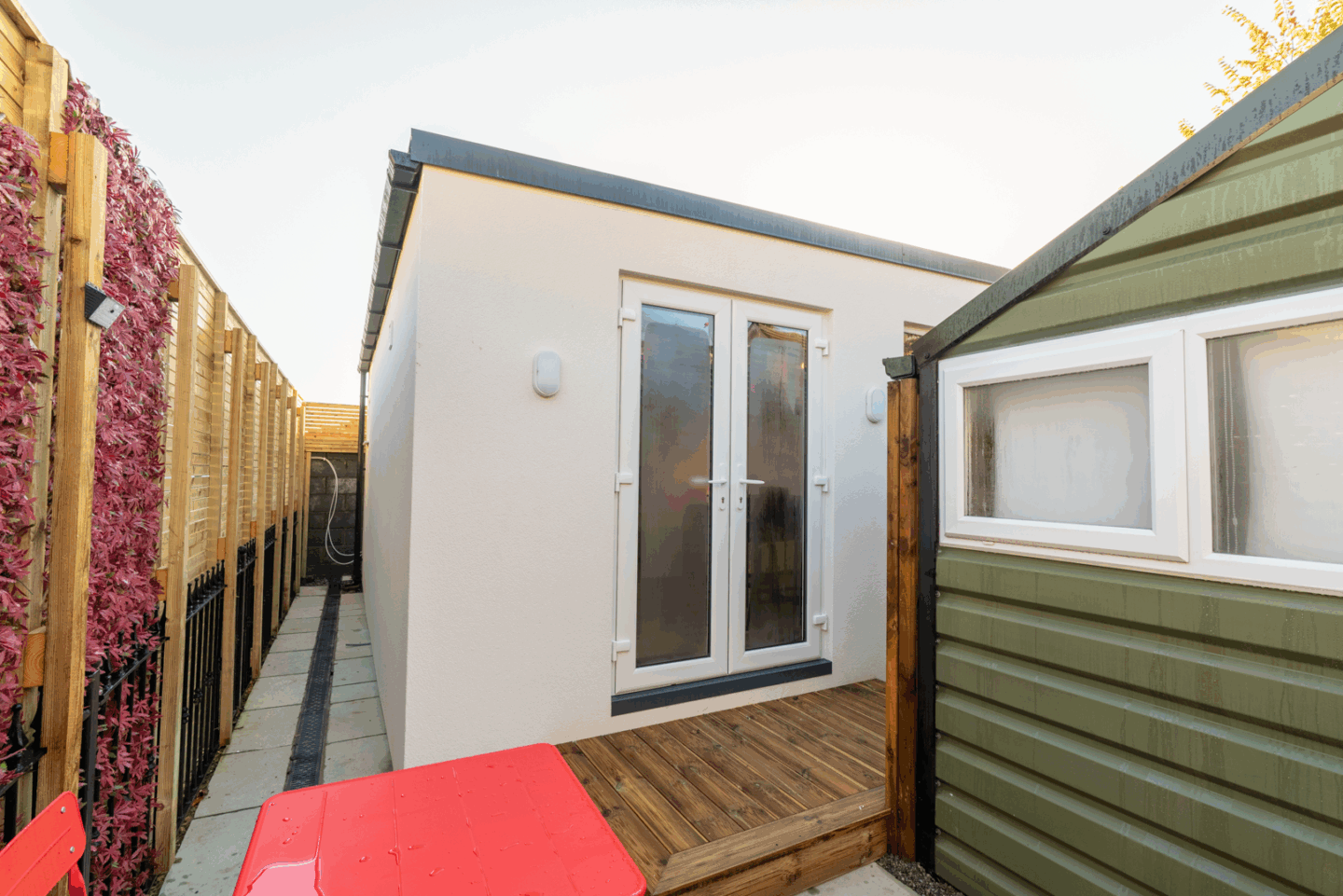 This garden room includes two bedrooms, a fully fitted kitchen, a modern bathroom, and a naturally lit open-plan living area, making it a complete small home. Designed for year-round use, it features quality insulation, premium fixtures, and a sleek, contemporary exterior.